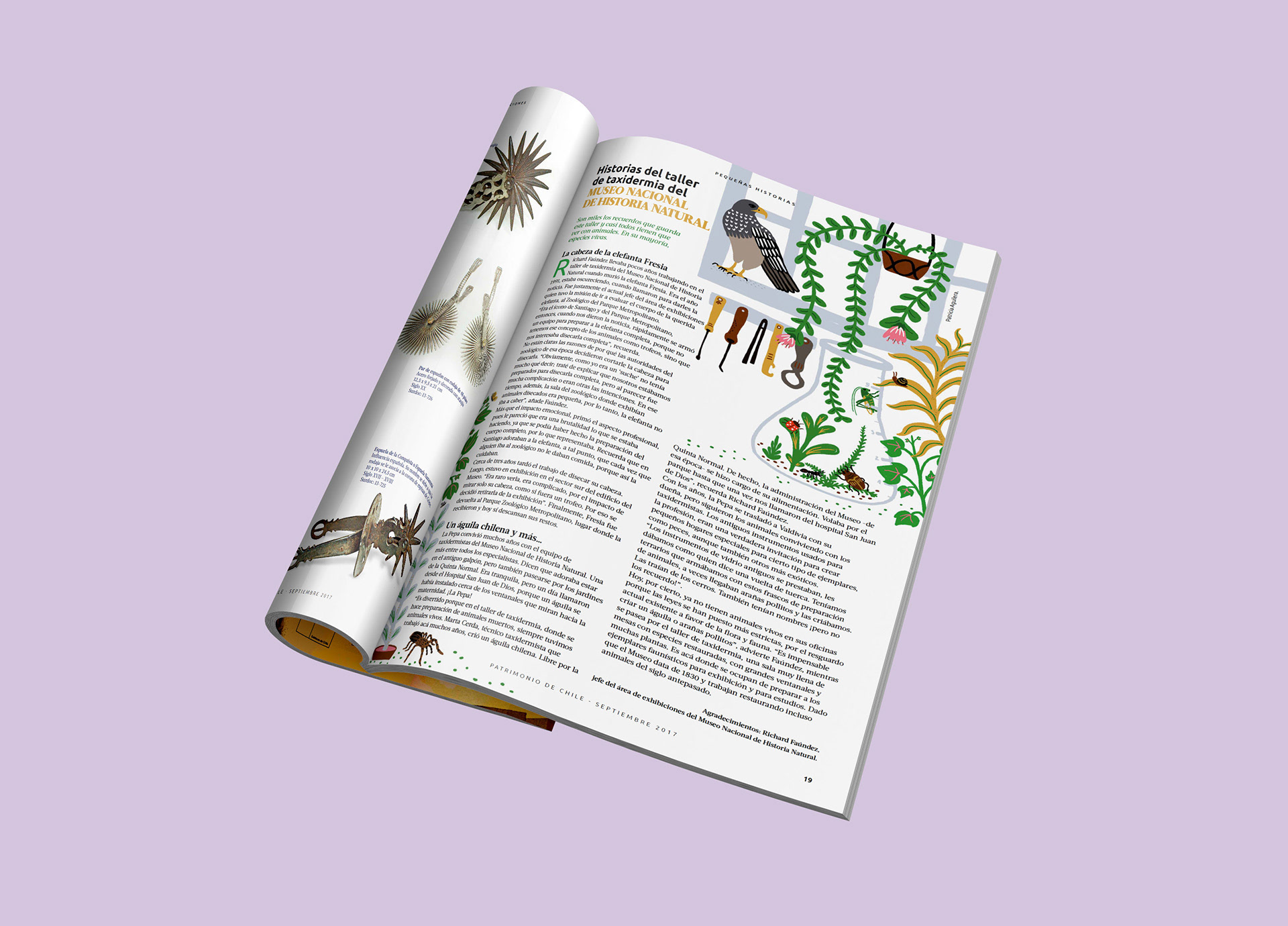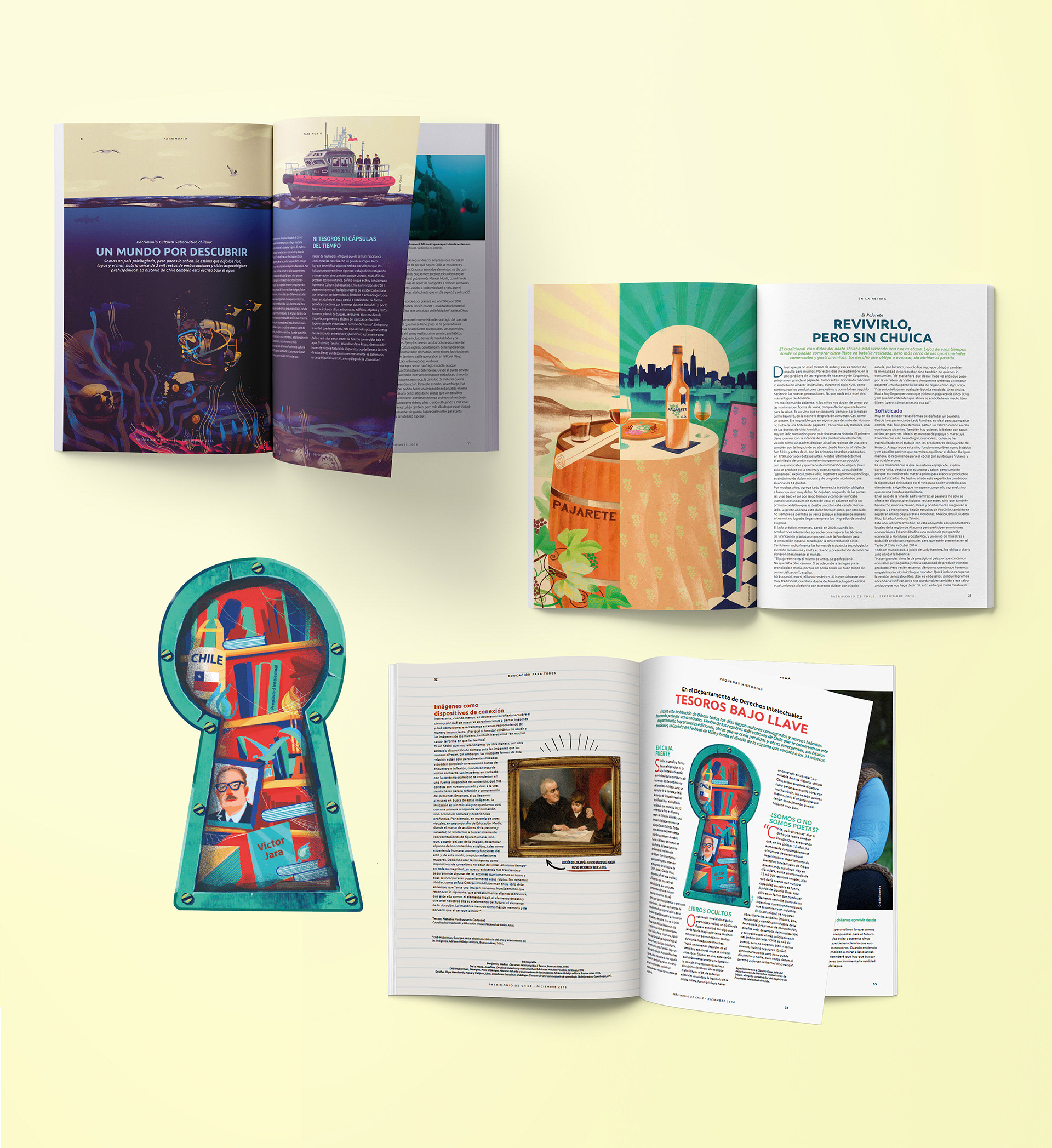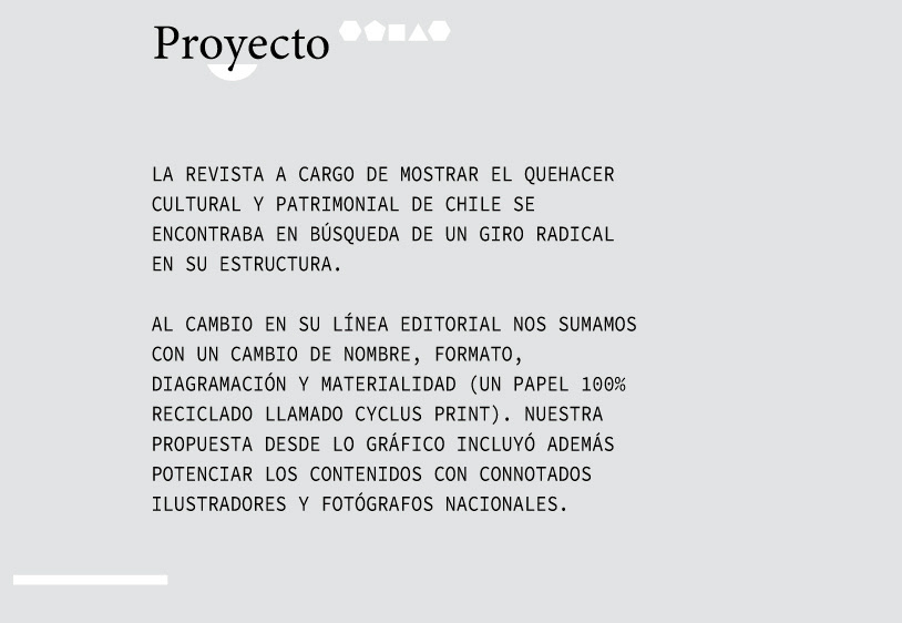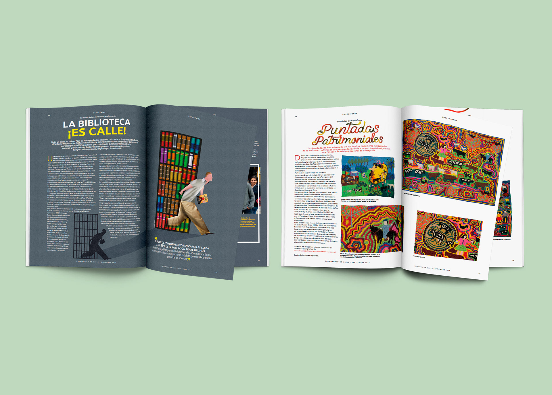 Branding y rediseño de revista del quehacer cultural y patrimonial en Chile. Trabajada en papel 100% reciclado (Cyclus Print) y con la participación en cada edición de ilustradores y fotógrafos nacionales.
